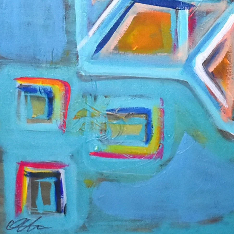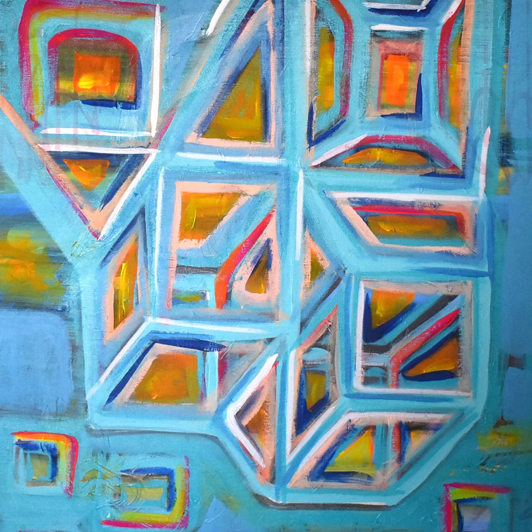 Each element in dimensions 2 seems to exist in its own spatial logic, with transparent layers that overlap and intersect, challenging the viewer's understanding of perspective. The painting invites a dialogue on the nature of space and reality, where each shape may represent a separate plane of existence or state of consciousness. The careful balance of color, form, and line in dimensions 2 is a testament to the artist's skill in creating a work that is both structurally rigorous and visually fluid, offering a rich, multi-layered experience that rewards prolonged contemplation. This painting would be a thought-provoking addition to any collection, perfect for those who appreciate the intersection of art, mathematics, and philosophy.