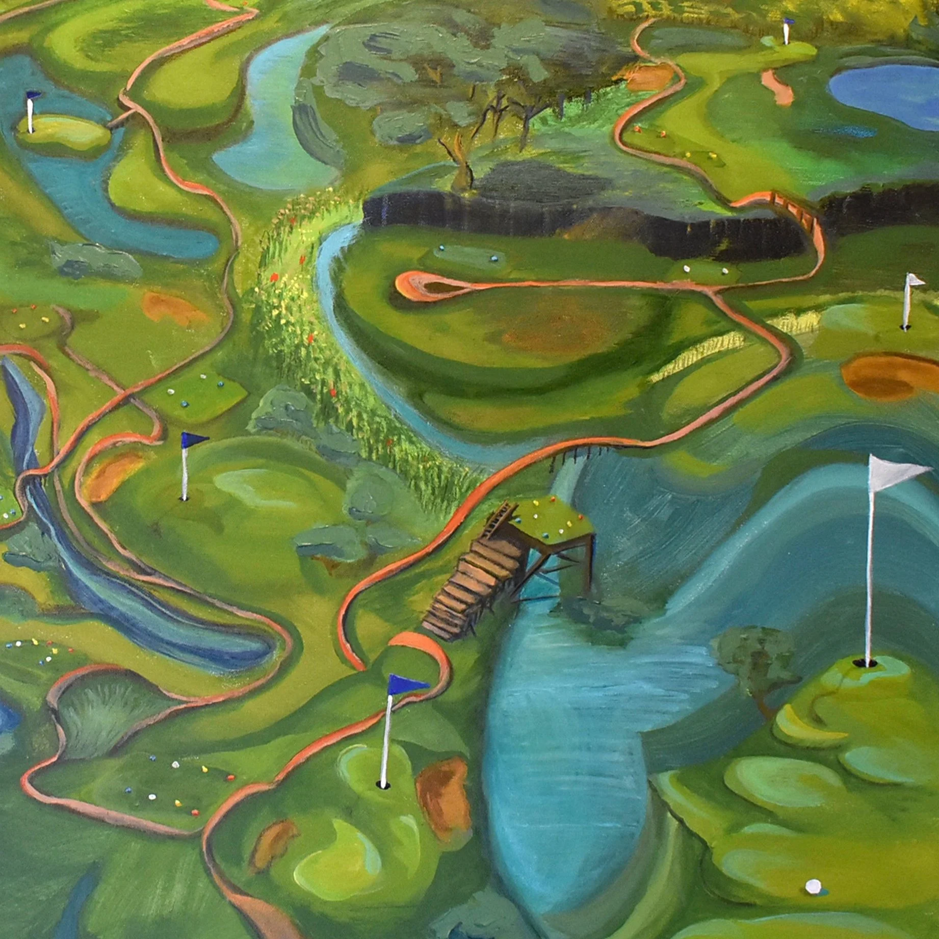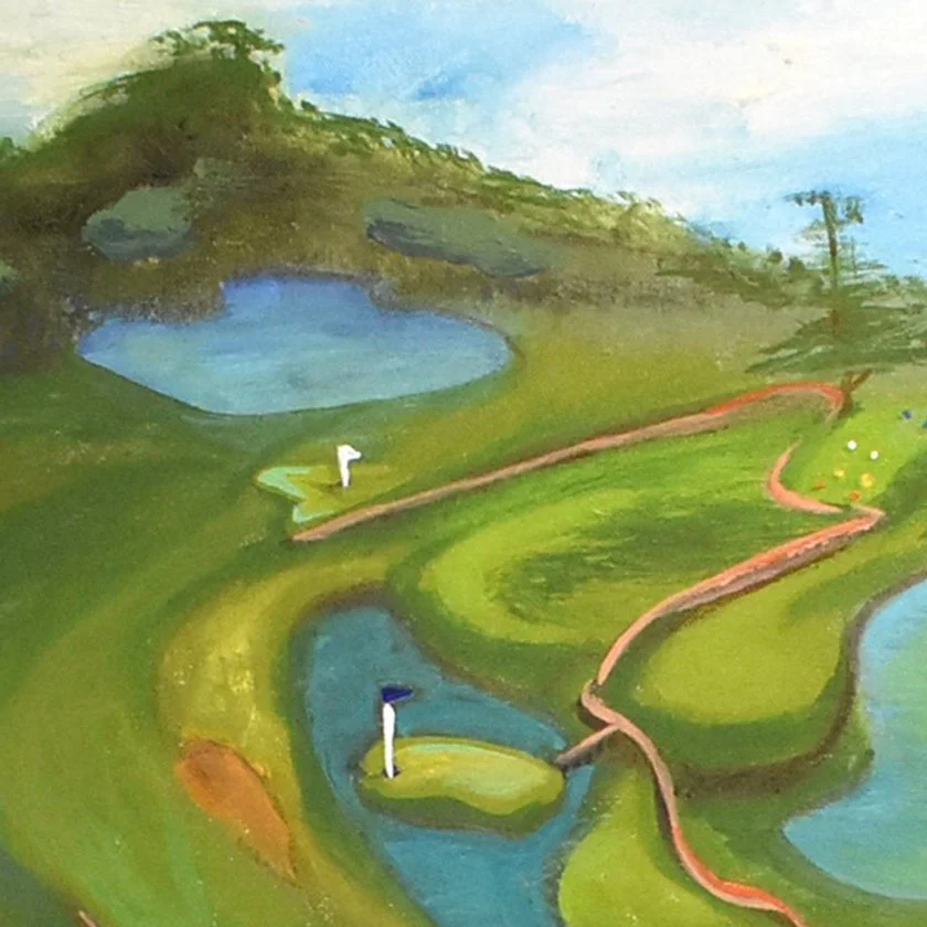 An enchanting landscape painting that captures the serene beauty of a golf course, masterfully transformed into a visual feast for the senses. The viewer is drawn into a surreal journey through the artist’s first foray into landscape painting, where the familiar terrain of a golf course is reimagined into a dreamlike vista. With an imaginative twist on perspective and form, the fairways undulate and weave like ribbons, defying conventional expectations of space and dimension. Ponds and bunkers are playfully exaggerated, becoming fantastical elements within an almost Alice-in-Wonderland-like topography. This piece expertly blurs the boundaries between reality and fantasy, as the golf course—usually a symbol of precision and order—becomes a stage for the artist's exploration into the unpredictable. The vivid colors and fluid shapes create an atmosphere that is both enchanting and disorienting, a hallmark of surrealist art. The undulating cart path and placement of tee boxes invites viewers to imagine themselves skillfully navigating this surreal landscape, offering an escape into the calm and focus that the game of golf provides.