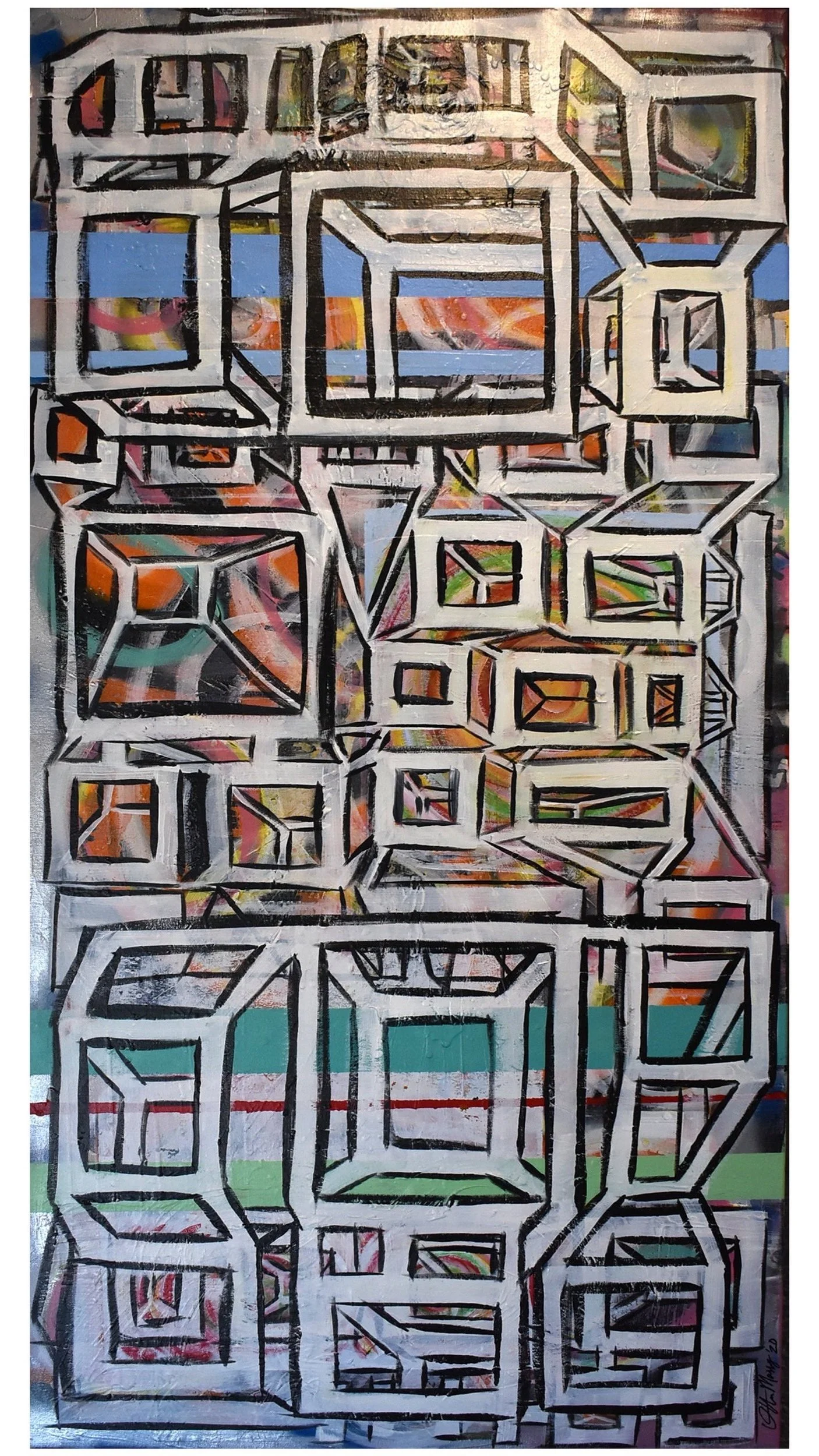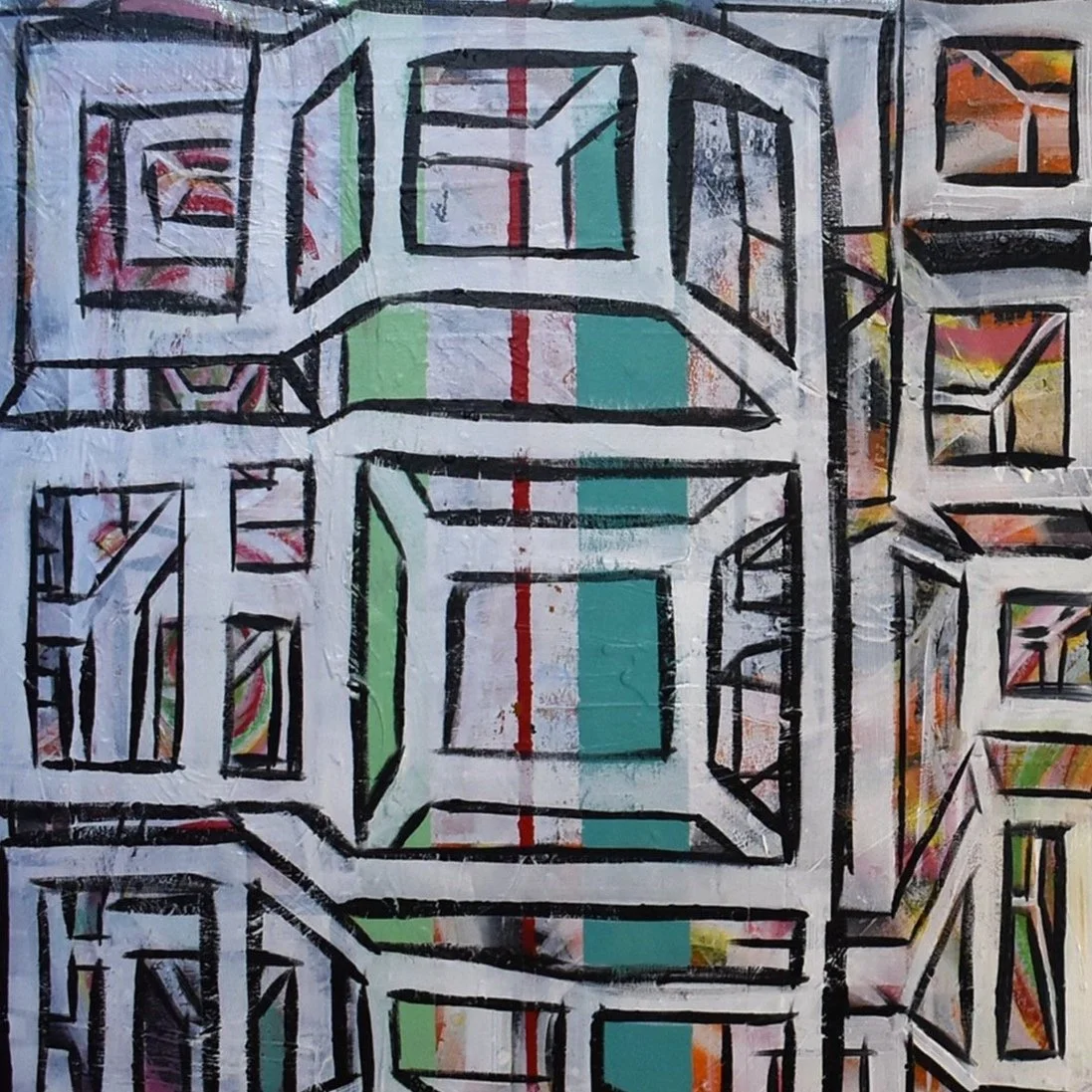 Dimensions is a captivating abstract composition that invites viewers into a labyrinth of geometric intrigue. The painting's array of overlapping squares and rectangles suggest windows into various worlds, each with its own unique perspective and story. The use of stark black outlines against the muted background allows each shape to pop, creating a feeling of depth and complexity. The artist plays with the perception of space, with some forms seeming to recede while others advance, challenging the viewer's sense of reality. Hints of vibrant colors peeking through the interstices add a playful element to the otherwise monochrome palette, hinting at the hidden layers and dimensions that lie just beyond the ordinary scope of vision.